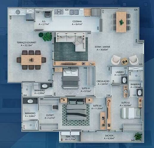 3 Dormitórios, sendo 3 suítes3 Banheiros2 Vagas1 Closet1 Cozinha1 Lavabo1 Sala de estar1 Área de serviço